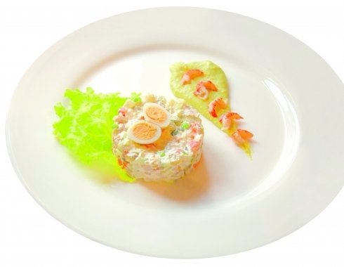 Салат Оливье с раковыми шейками.