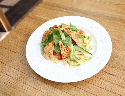 Томаты, свежий огурец, цукини-гриль, листья салатов Романо, Айсберг, Лолло Росса с обжаренными кусочками индейки и болгарским перцем, в острой кисло –сладкой заправке на основе натурального йогурта, меда и чили- соуса 300г.